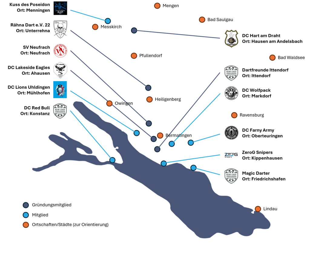 Unsere Gründungsmitglieder stammen aus den Ortschaften Bermatingen-Ahausen, Ittendorf, Heiligenberg-Unterrehna, Salem-Neufrach und Hausen am Andelsbach. Gemeinsam haben wir eine Plattform geschaffen, die den lokalen Steeldart-Mannschaften die Möglichkeit bietet, sich zu messen und weiterzuentwickeln.